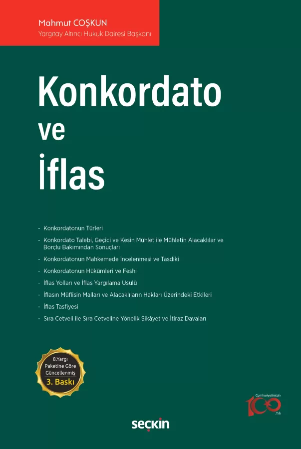 Eserin içeriğinde; konkordatonun türleri, konkordato talebi, geçici ve kesin mühlet ile mühletin alacaklılar ve borçlu bakımından sonuçları, konkordatonun tasdiki, konkordatonun hükümleri ve feshi, iflas yolları, iflas yargılaması, iflasın müflisin malları üzerinde ve alacaklıların hakları üzerindeki etkileri, iflas tasfiyesi, sıra cetveli, sıra cetveline yönelik şikâyet ve itiraz davaları, konkordato ve iflasla ilgili suç ve disiplinsizlik eylemleri ile yargılama usullerine yer verilmiş, yeni baskı 02.03.2024 tarih 7499 sayılı Kanunla yapılan değişikliklere göre güncellenmiştir.